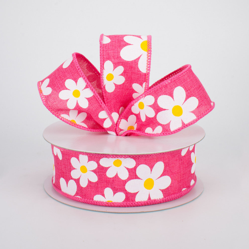 1.5"x10yd Flower Daisy Bold Print On Royal Burlap, Hot Pink/White/Yellow 1A