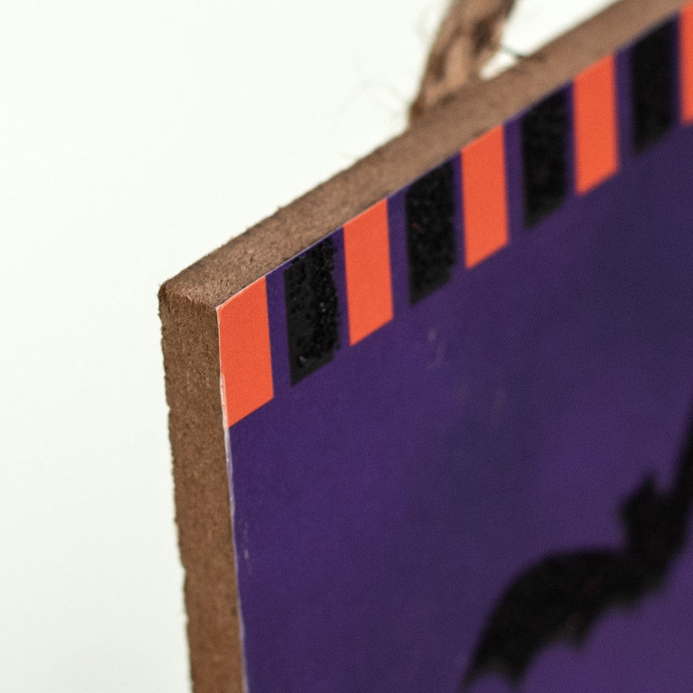 Embrace the Halloween spirit with this spooky 12.5"L x 6"H Happy Halloween Sign. Designed with a witch, black cat, and bats, and bordered by a striped pattern in orange, purple, black, and soft yellow, this sign is perfect for Halloween gatherings or greeting trick-or-treaters. Made of MDF wood, paper, and twine, this eye-catching sign is sure to add a festive touch to any setting. Get ready for the holiday with this hauntingly delightful sign!