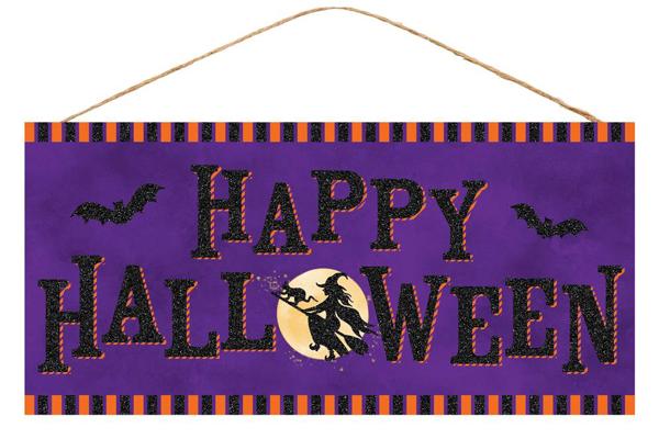 12.5"L x 6"H Happy Halloween Sign w/Striped Edge, Orange/Purple/Black/Soft Yellow WS5