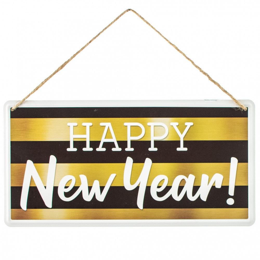 This 12" x 6" Happy New Year Sign features a festive two-tone design of black and gold. Crafted from tin and measuring 12" x 6", the sign comes with an attached twine hanger for easy display. Ideal for a New Year's wreath, gift or party décor.
