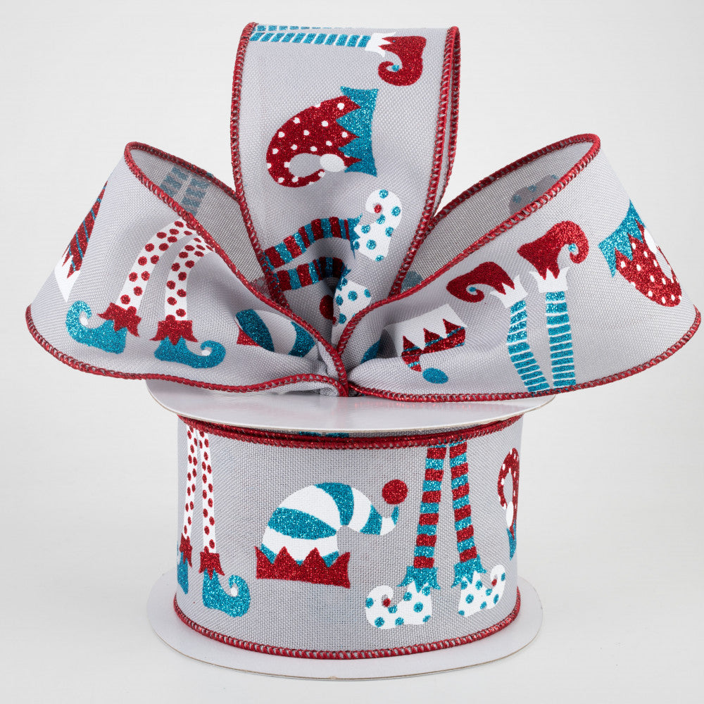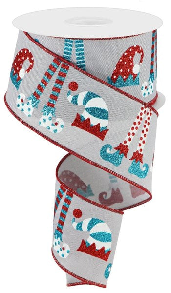 2.5"x10yd Elf Hats And Legs On Royal Burlap, Grey/White/Red/Turquoise OC23